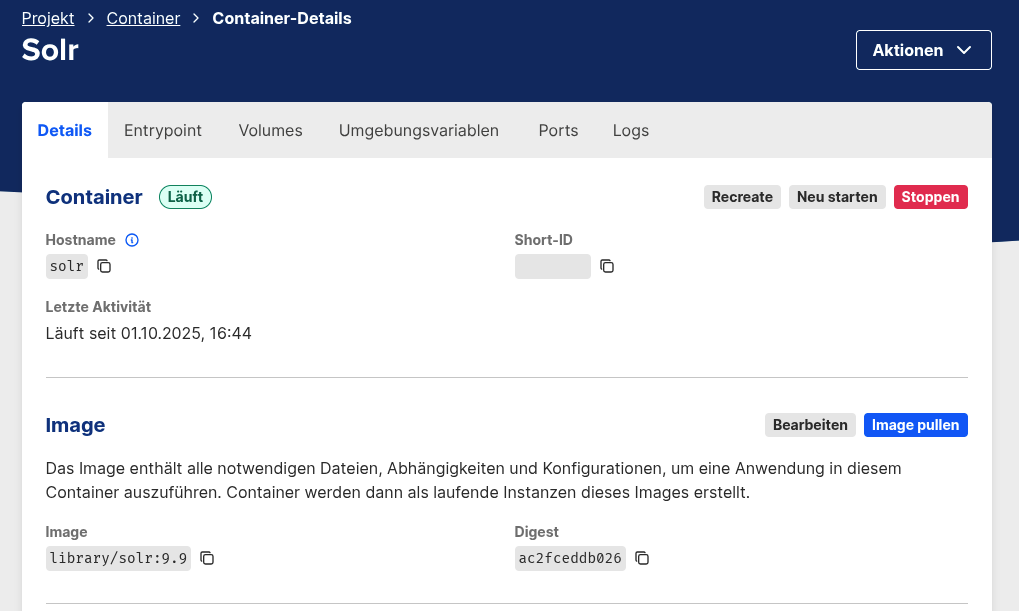 However, our customer projects at Mittwald run on the newer cloud infrastructure, which can be managed via the mStudio management interface. One of the newer features now available there is the option of container hosting. This allows a project to start Docker containers and access them. Since Solr is available as a Docker container in principle, it made sense for us to run Solr as a Docker container alongside the projects in order to continue providing the functionality. This also has the advantage that the search server is operated closer to the application from a technical perspective, which reduces latency during access and promises slightly higher performance overall. In addition, it is also true that booking separate Solr packages has always been associated with additional costs, which are significantly lower in direct comparison with container hosting.