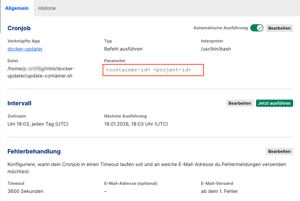 Each container update requires both project-id and container-id. Get them via CLI or mittwald's interface.